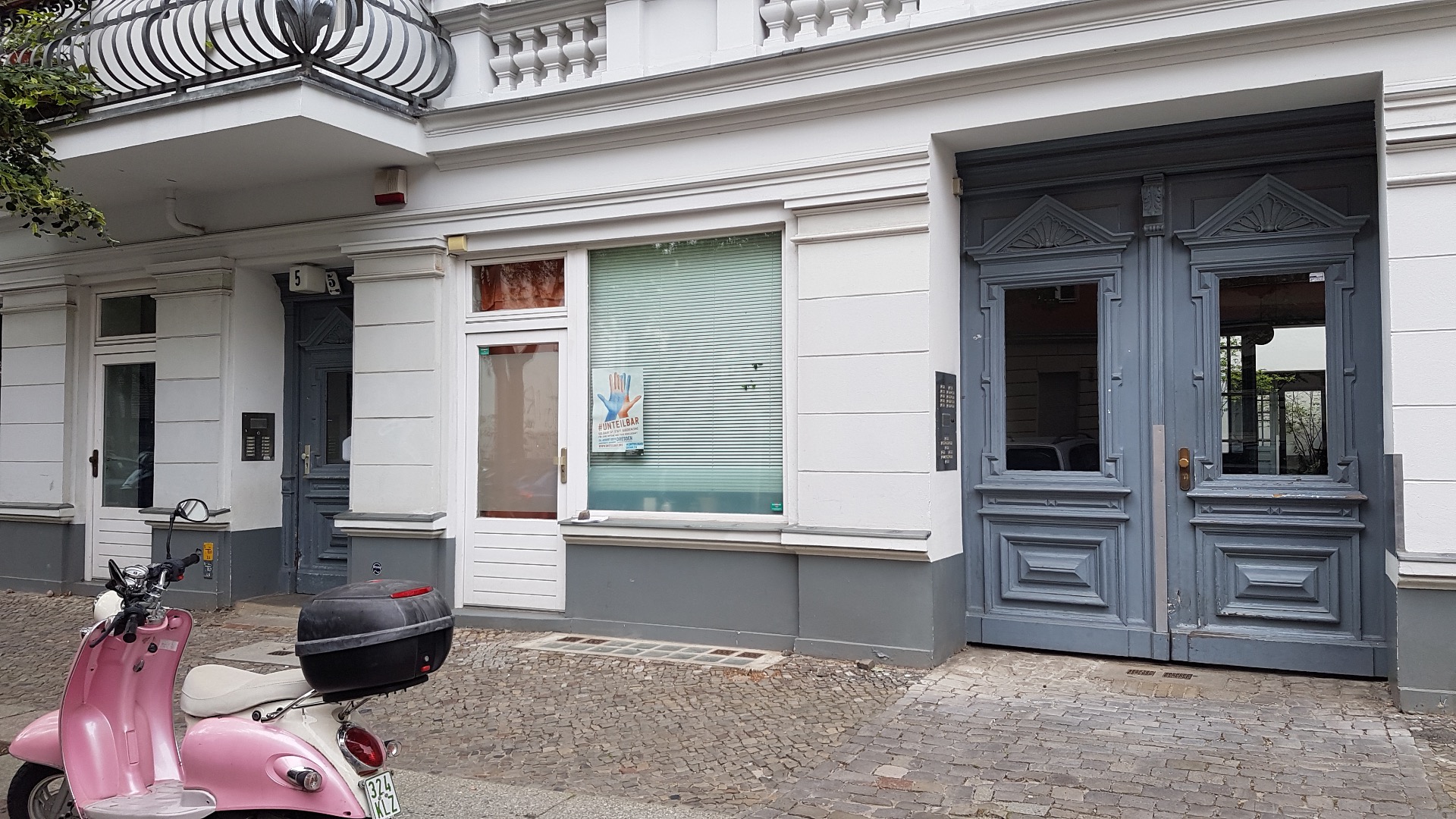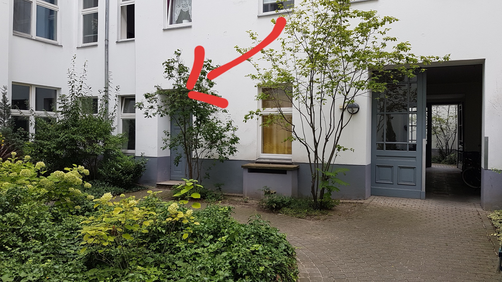 Gå videre på venstre side av Merseburger Strasse, til du kommer til nr 5, omtrent midtveis i gaten. Gå forbi døren der det står nr 5, og videre til den blå porten ved siden av. Gå gjennom porten og inn i den første bakgården. Ikke gå gjennom neste portrom, men inn i den lille blå døren som ligger til venstre for portrom nr 2.